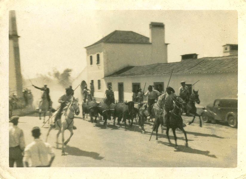 Entrada de touros no Pombalinho pela estrada do campo, assim era designada a rua Manuel Monteiro Barbosa, no ano de 1948. É um belo registo histórico da